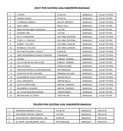 Diektahui 23 atlet asal kabupaten Banggai tersebar di cabor atletik, balap sepeda, voli, catur, dayung, karate, panahan, panjat tebing, panjat tebing, paralayang, petanque, renang, sepak bola, sepak takraw, taekwondo dan triathlon. (bar)
